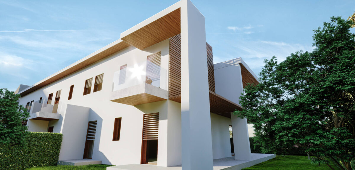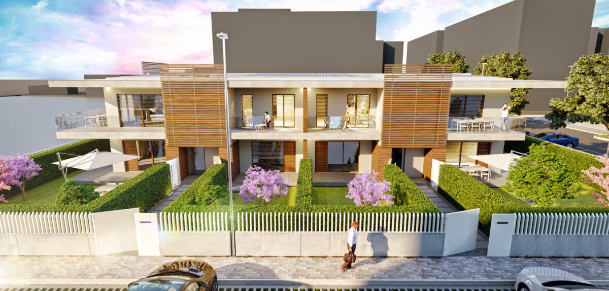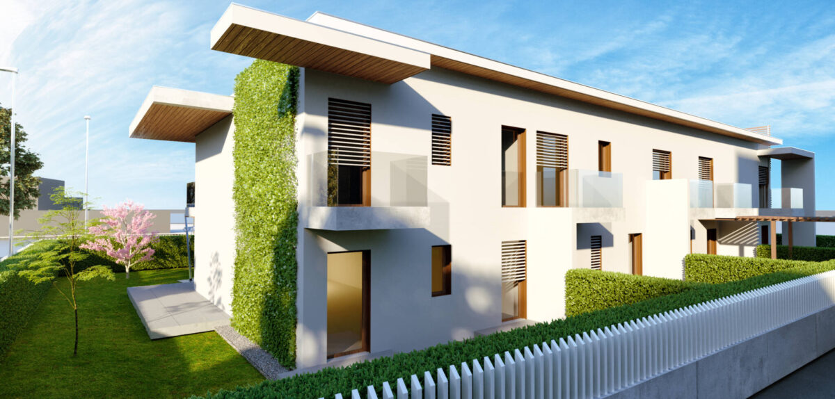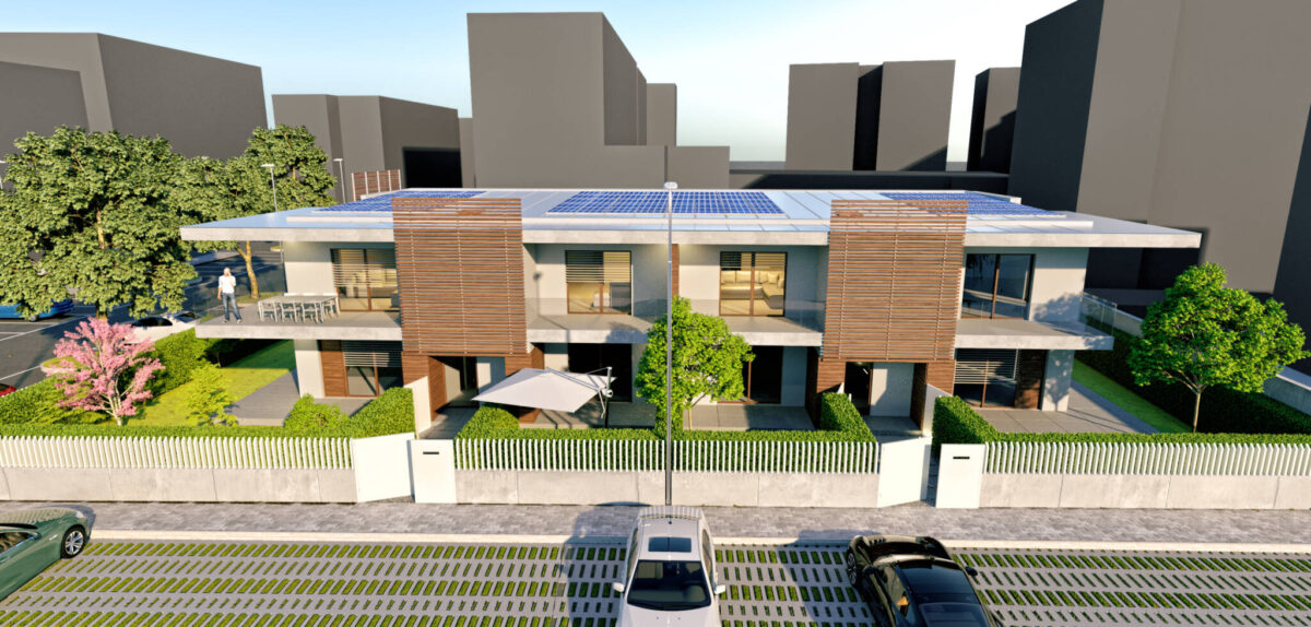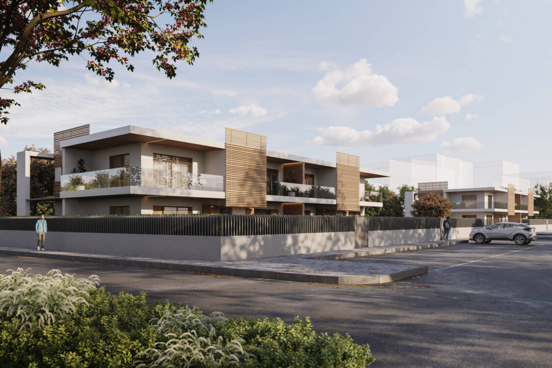 Il costruito si ergerà su due piani fuori terra di forma prettamente rettangolare, giardini spazi coperti e logge ne formeranno i prospetti principali, i corpi scala saranno ben distinguibili da elementi frangisole.