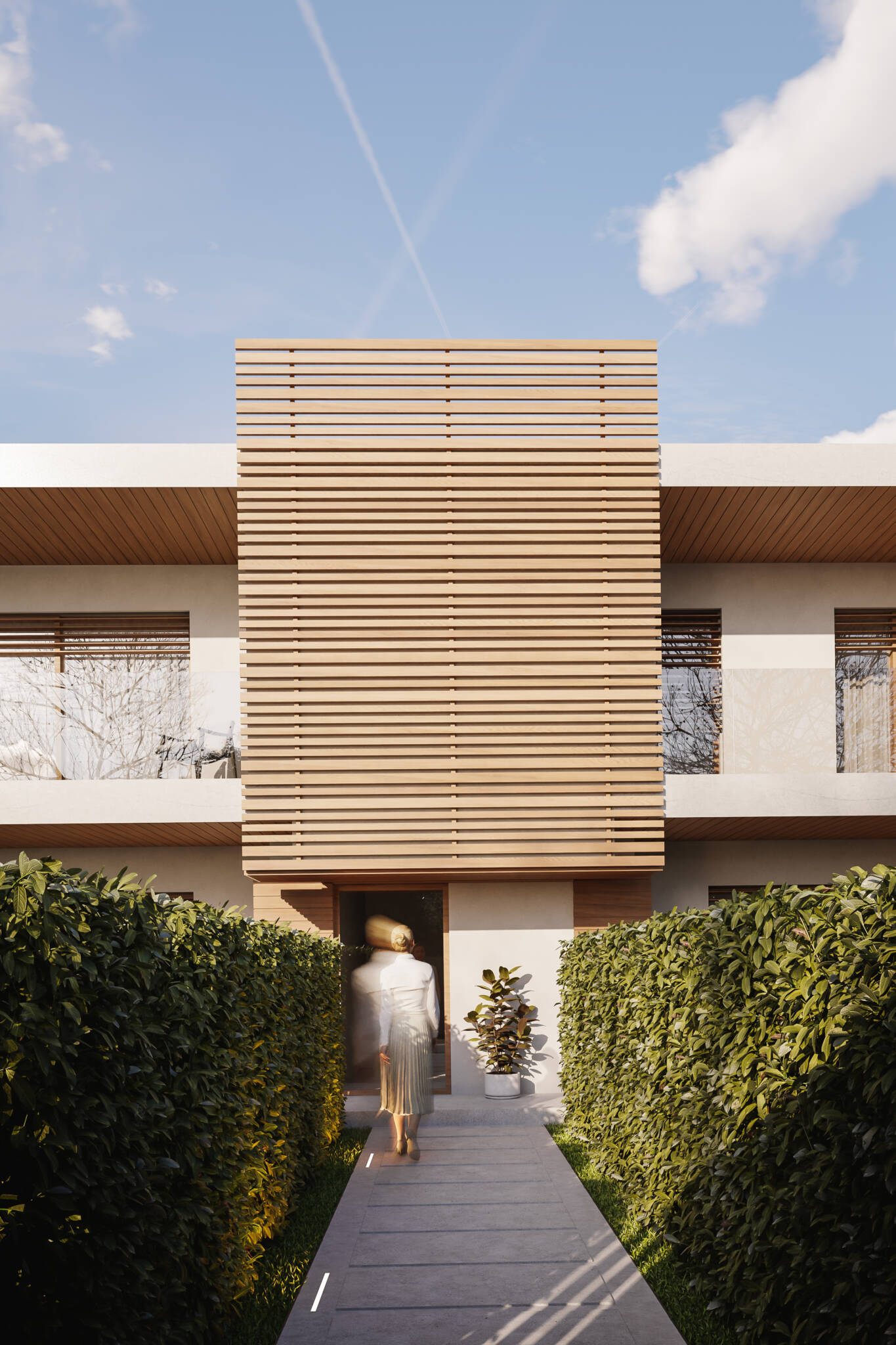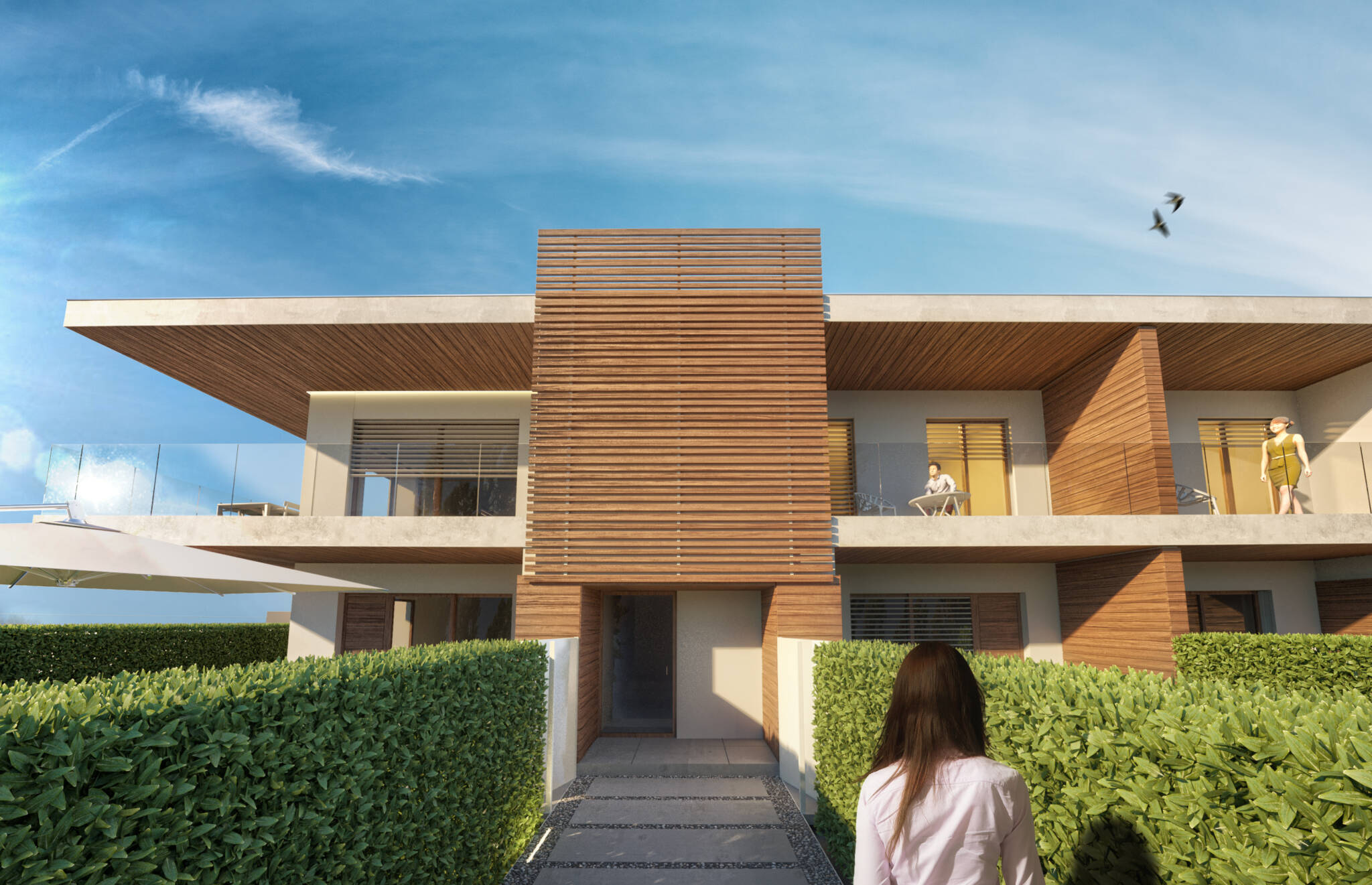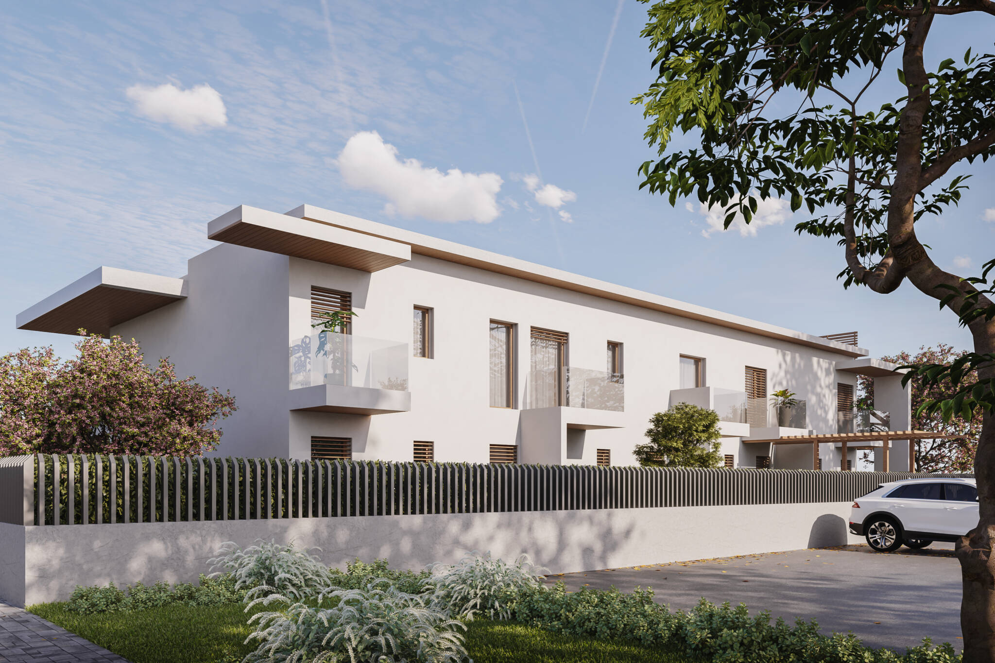 Il costruito si ergerà su due piani fuori terra di forma prettamente rettangolare, giardini spazi coperti e logge ne formeranno i prospetti principali, i corpi scala saranno ben distinguibili da elementi frangisole.